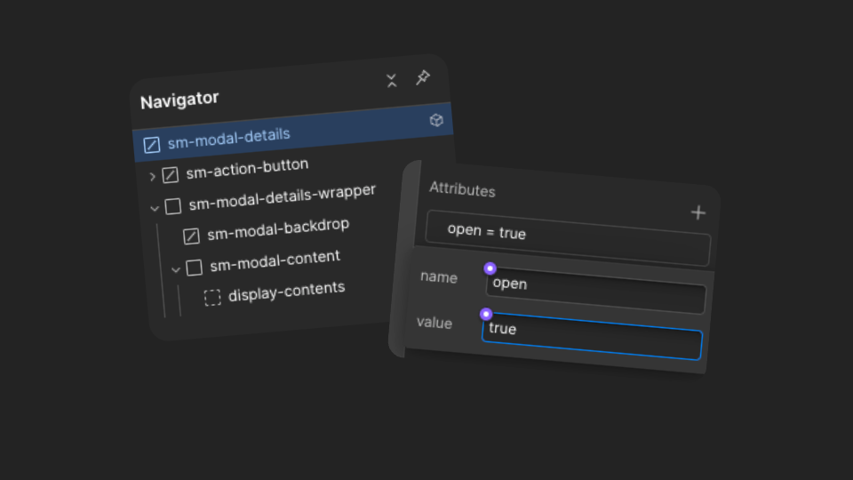 To edit the Filters modal, simply select the custom element sm-modal-details in the navigator and add the following custom attribute in the Settings panel: